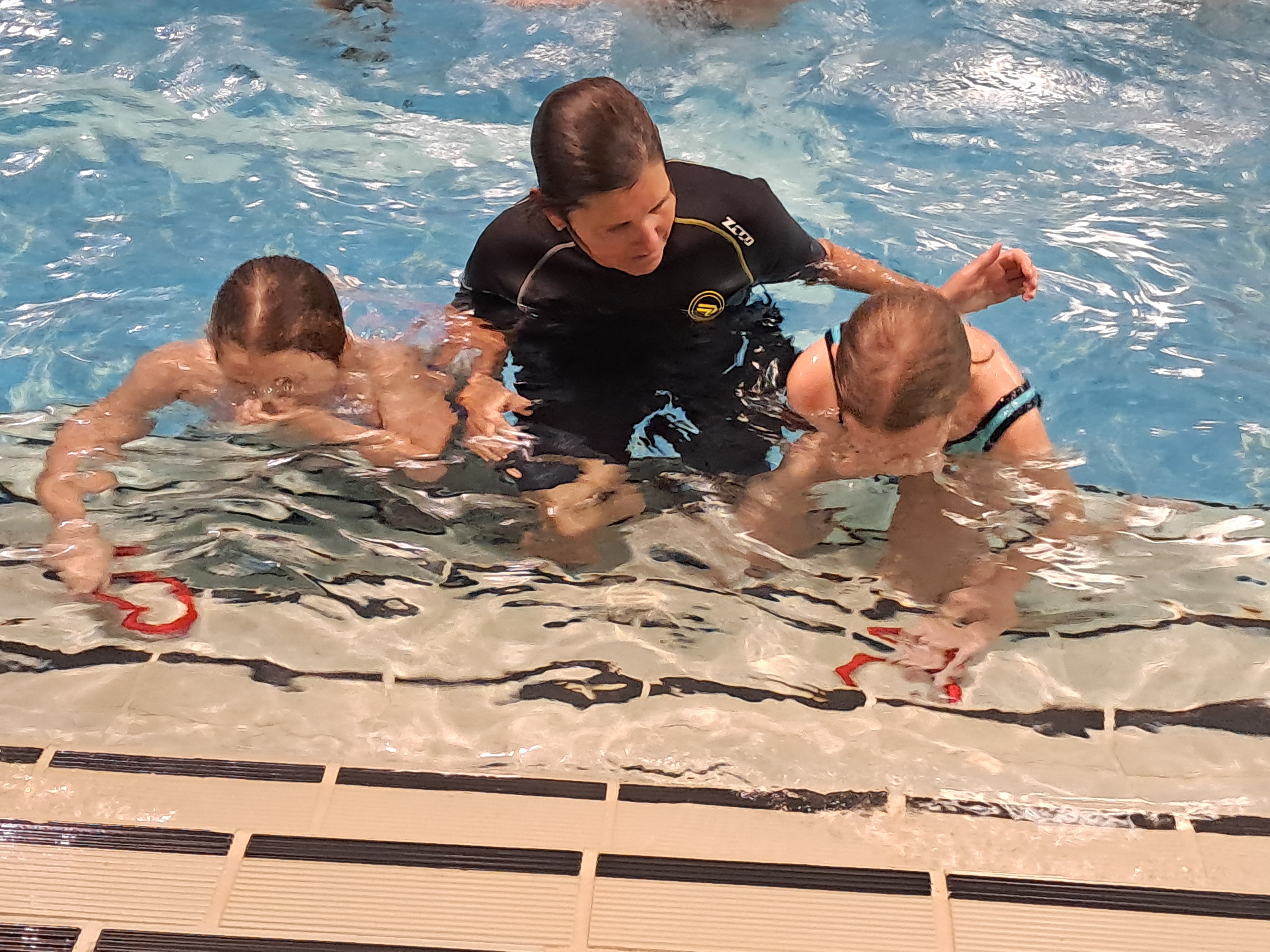 Die Angst vor dem Wasser zu nehmen, ist eine wichtige Voraussetzung fürs Schwimmenlernen, das haben die Kinder auf Anhieb und intuitiv gelernt, weil die beiden Schwimmtrainer sie ganz ohne Druck und mit Gespür für jedes einzelne Kind mit dem Wasser vertraut machen. Freilich hören sie auch erste Baderegeln wie etwa: Niemanden schubsen oder untertauchen, nicht rennen und nicht vor Lehrerin oder Lehrer ins Becken gehen. Aber all das funktioniert in entspannter, liebevoller Atmosphäre, Karin und Olaf Pfeiffer vermitteln Spaß am und im Wasser, Freude am Bewegen und am Erfolg, wenn das Wasser dann tatsächlich trägt.