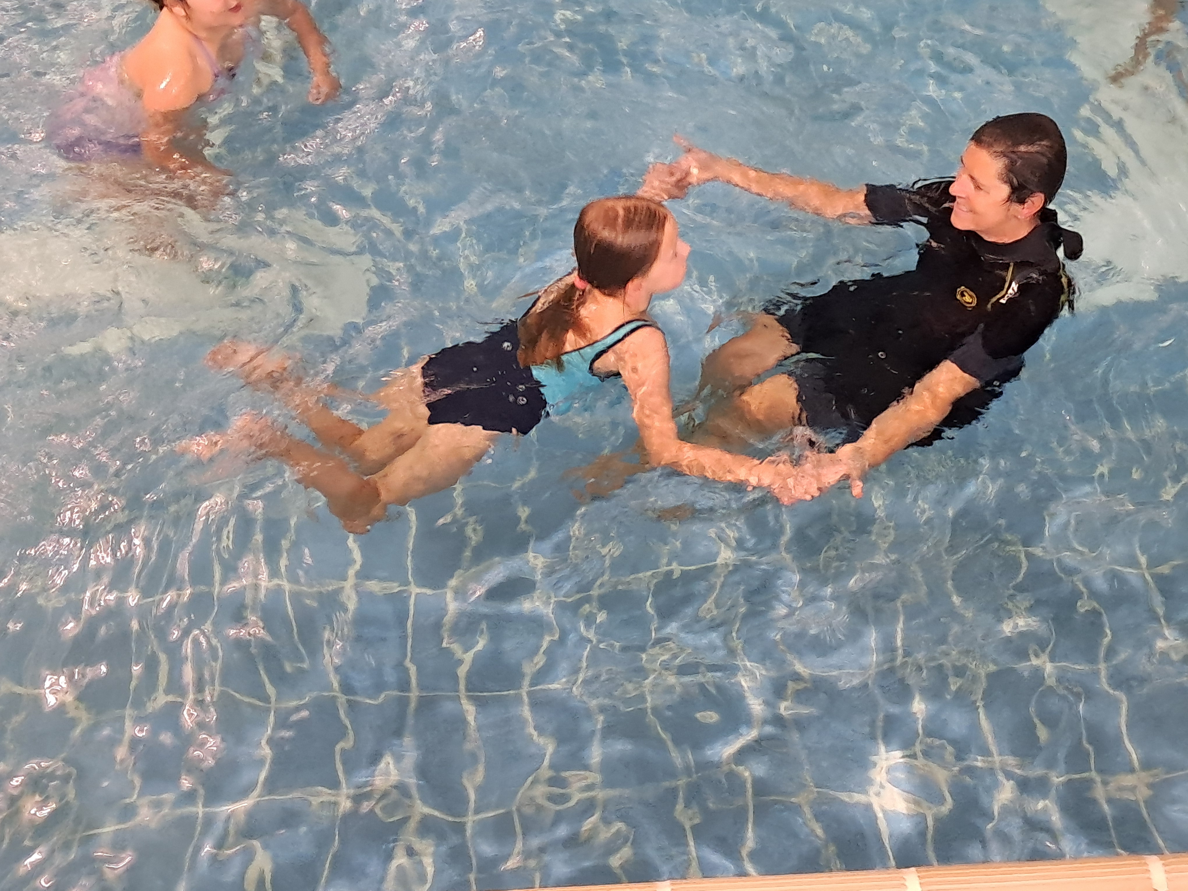 Die erste Dreiviertelstunde Schwimmkurs hat den Acht- bis Elfjährigen einen Riesenspaß gemacht. Die neun Kinder – alle schon etwas älter als „normalerweise“ die Schwimmkursteilnehmer – haben sich flach aufs Wasser gelegt, unter Wasser geblubbert und sich kräftig vom Rand abgestoßen. „Tauchen kann ich aber nicht“, hatte ein Mädchen zwar vorsorglich verkündet. Aber dann ist die Kleine mit Schwimmlehrerin Karin Pfeiffer an der Hand gleich mehrere Meter unter Wasser unterwegs – „wie ein Fisch“, lobt die Trainerin begeistert.