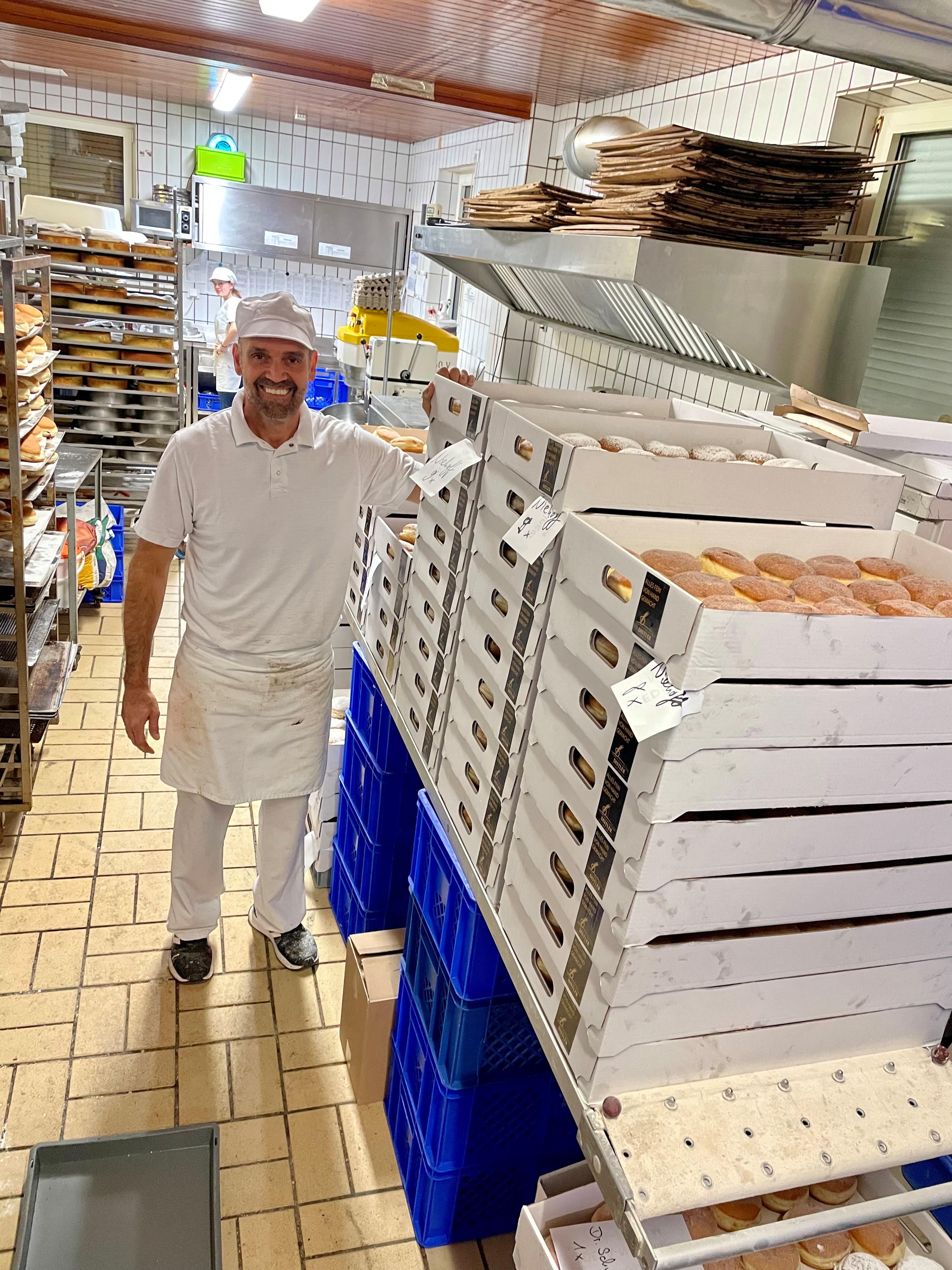 Bäckermeister Gerd Distler mit seiner frühmorgendlichen Krapfenproduktion für die Fahrerinnen und Fahrer des Lions Clubs.